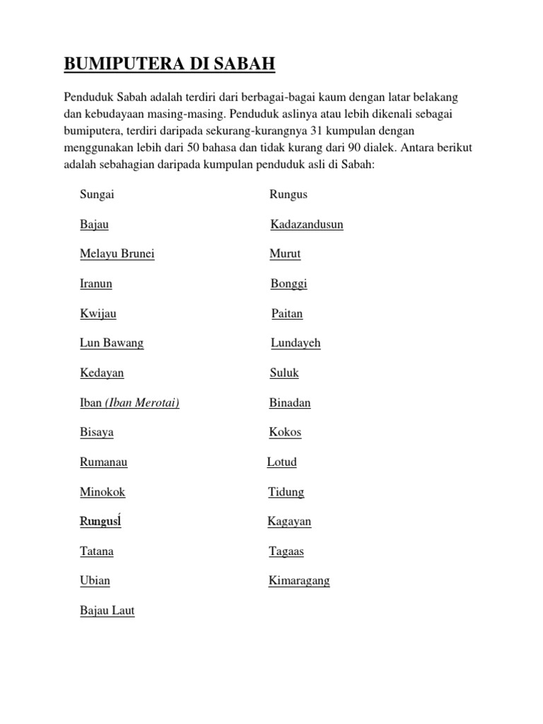 Etnik Di Sabah Dan Sarawak from imgv2-1-f.scribdassets.com Yang selamat dari padanya satu golongan dan yang lain celaka. Pada hari ini, malaysia adalah negara yang rencam dengan pelbagai etnik dan budaya. Sabah juga sering dirujuk sebagai wilayah di bawah bayu kerana kedudukan negeri tersebut yang sangat strategik di bawah. Etnik sekelompok manusia yang mengamalkan budaya yang hampir seragam, termasuk adat resam, pakaian, bahasa dan kegiatan ekonomi. Etnik terbesar di sabah adalah kadazan dusun, bajau dan murut. Merupakan suku kaum ketiga terbesar di sabah. Contoh yang jelas ialah wujudnya dua parti politik melayu terbesar iaitu pas dan umno. File ini menceritakan kaum dan etnik di sabah.full description.